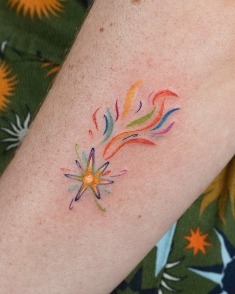 This vibrant tattoo explodes with color, featuring rainbow trails bursting from a golden star. The swirling hues of red, blue, green, and purple bring the magic of fireworks to skin, elevating the classic shooting star into a festival of light.