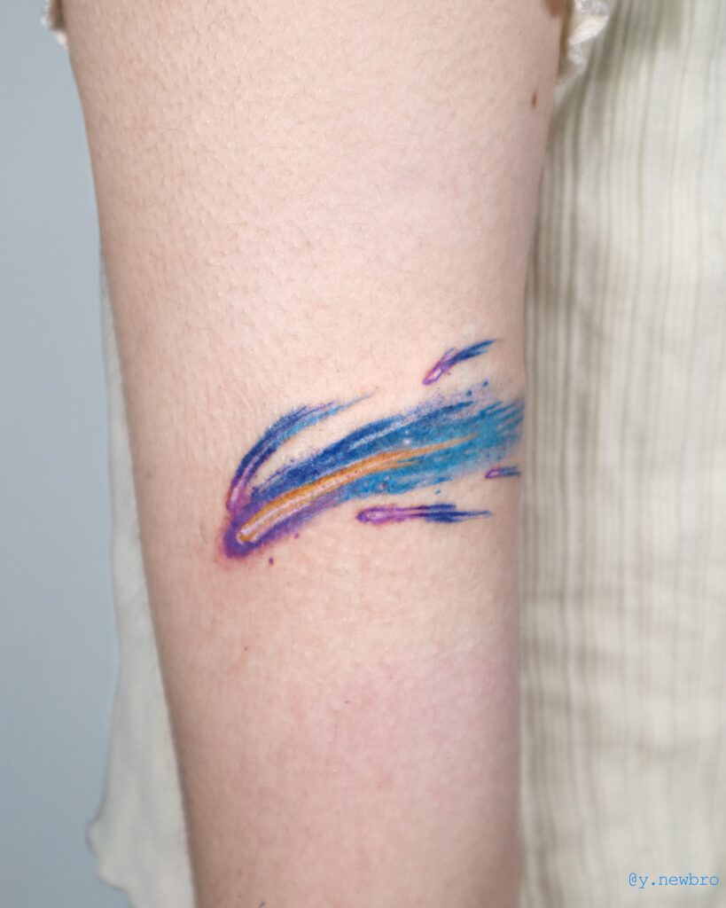 This tattoo captures the fiery rush of a meteor streaking across the skin. Shades of blue, purple, and orange blend together to create a glowing comet-like effect that feels alive with energy.