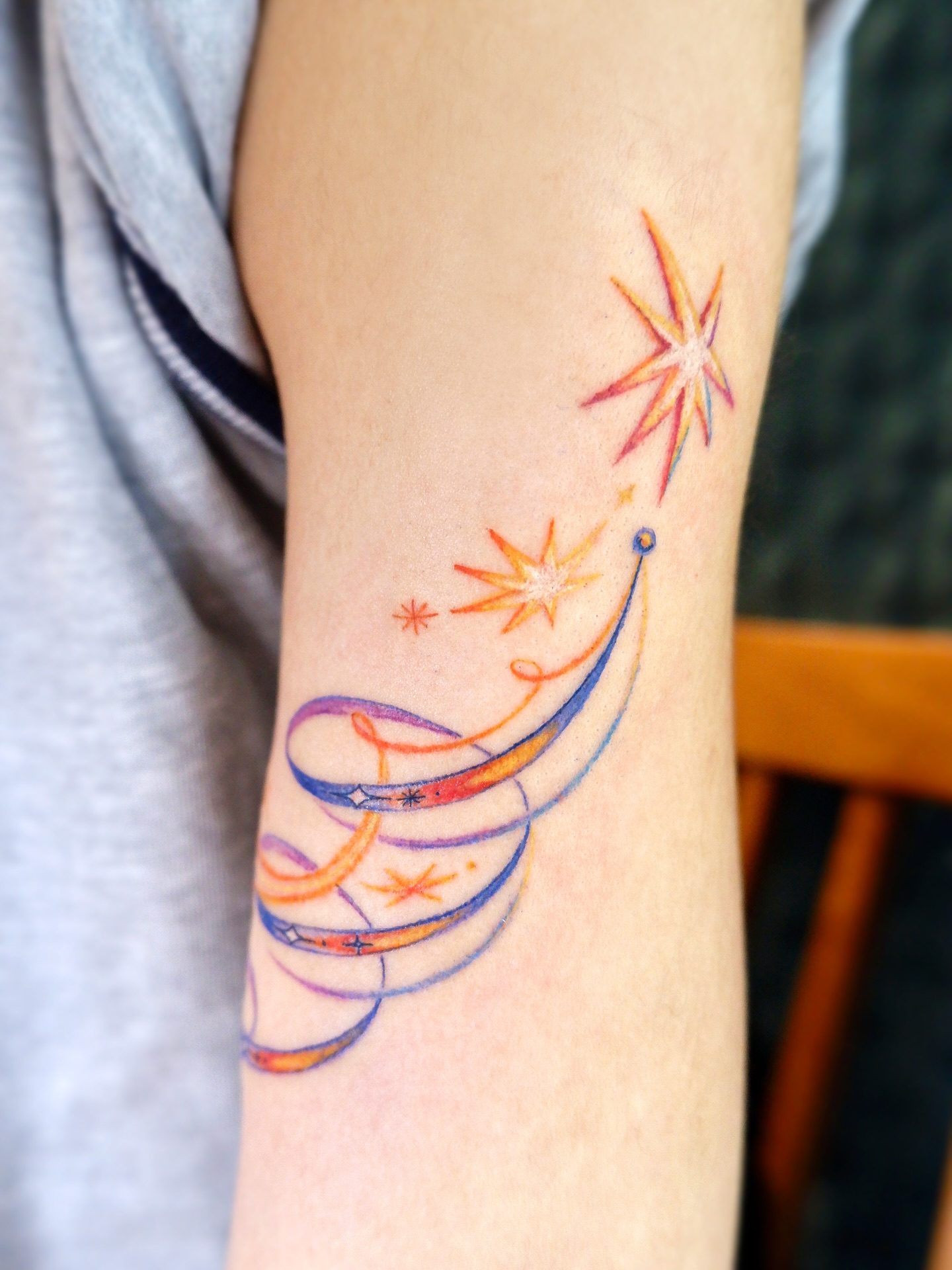 This creative tattoo combines swirling ribbon-like trails with multiple sparkling stars, wrapping around the arm in flowing elegance. The pastel shades of orange, purple, and blue enhance its dreamy, whimsical look.