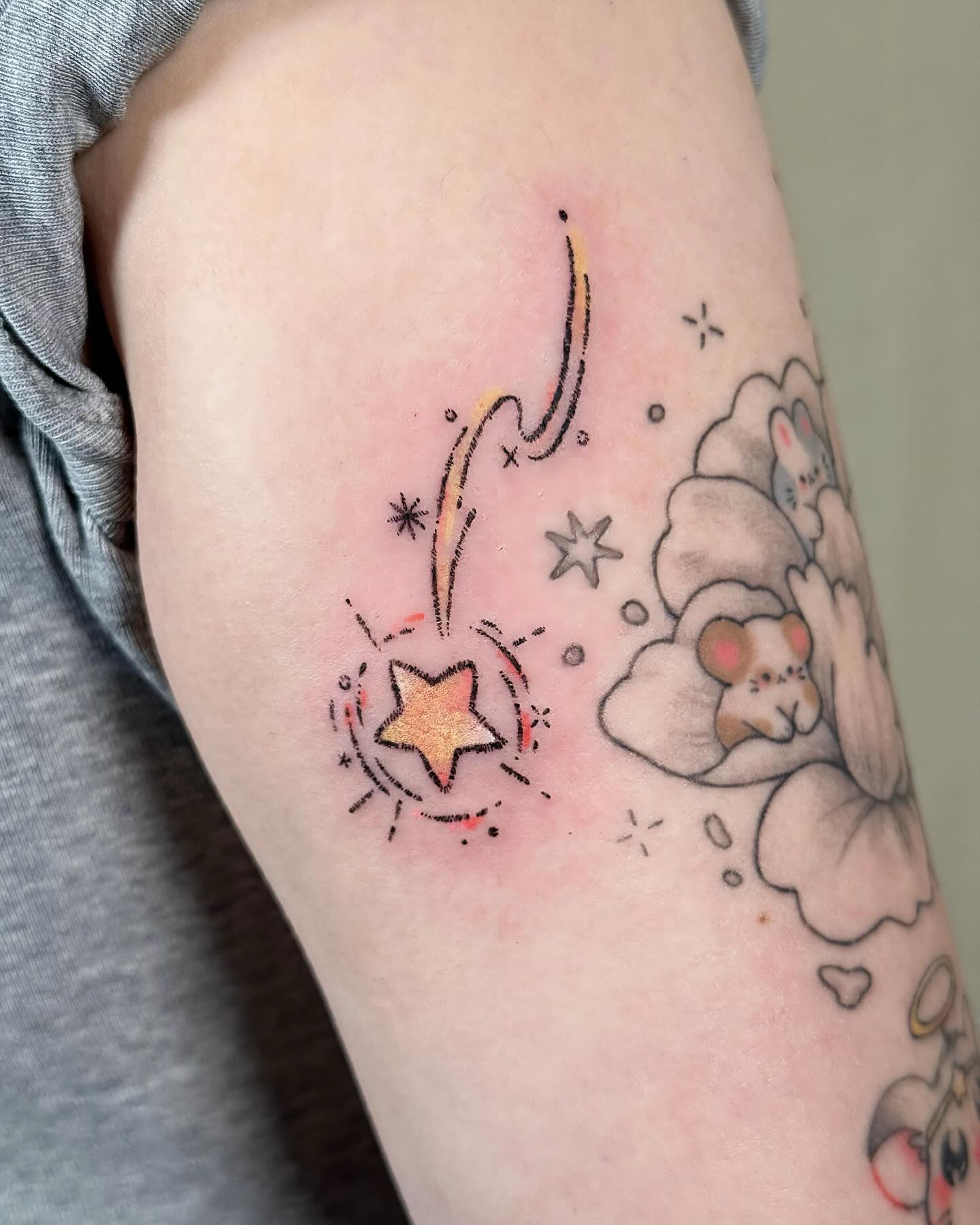 This tattoo combines a golden star with playful dotted details and surrounding tiny constellations. The shooting trail curves gracefully, giving the design movement and lightness.