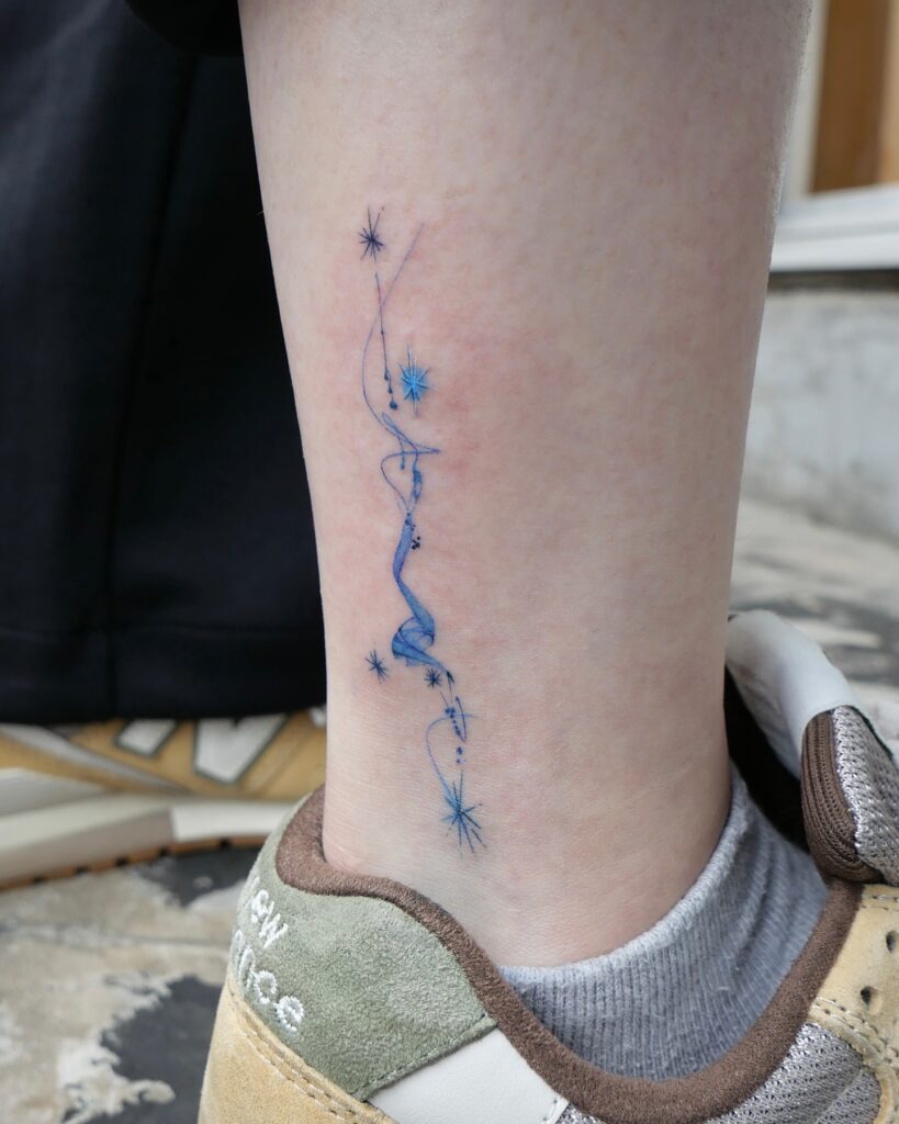 This ankle tattoo uses delicate blue ink to depict stars connected by fine swirling trails. The flow creates a sense of elegance and lightness, almost like a constellation in motion.