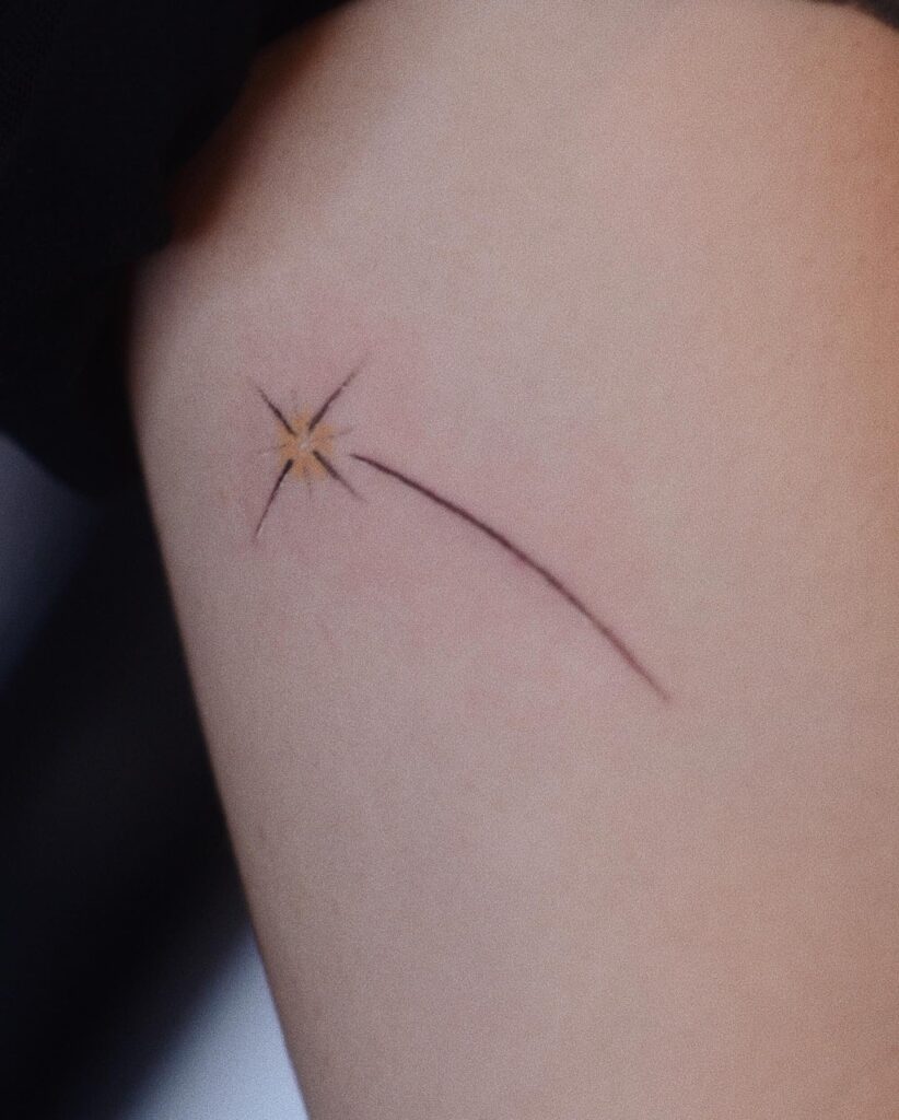 This delicate tattoo features a fine black line trailing from a soft golden starburst, capturing the fleeting beauty of a shooting star. The minimal style makes it perfect for those who prefer understated designs that still carry deep meaning.