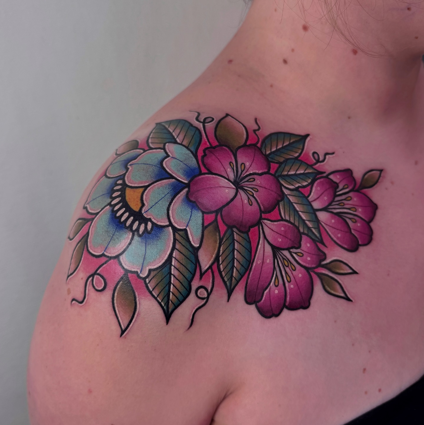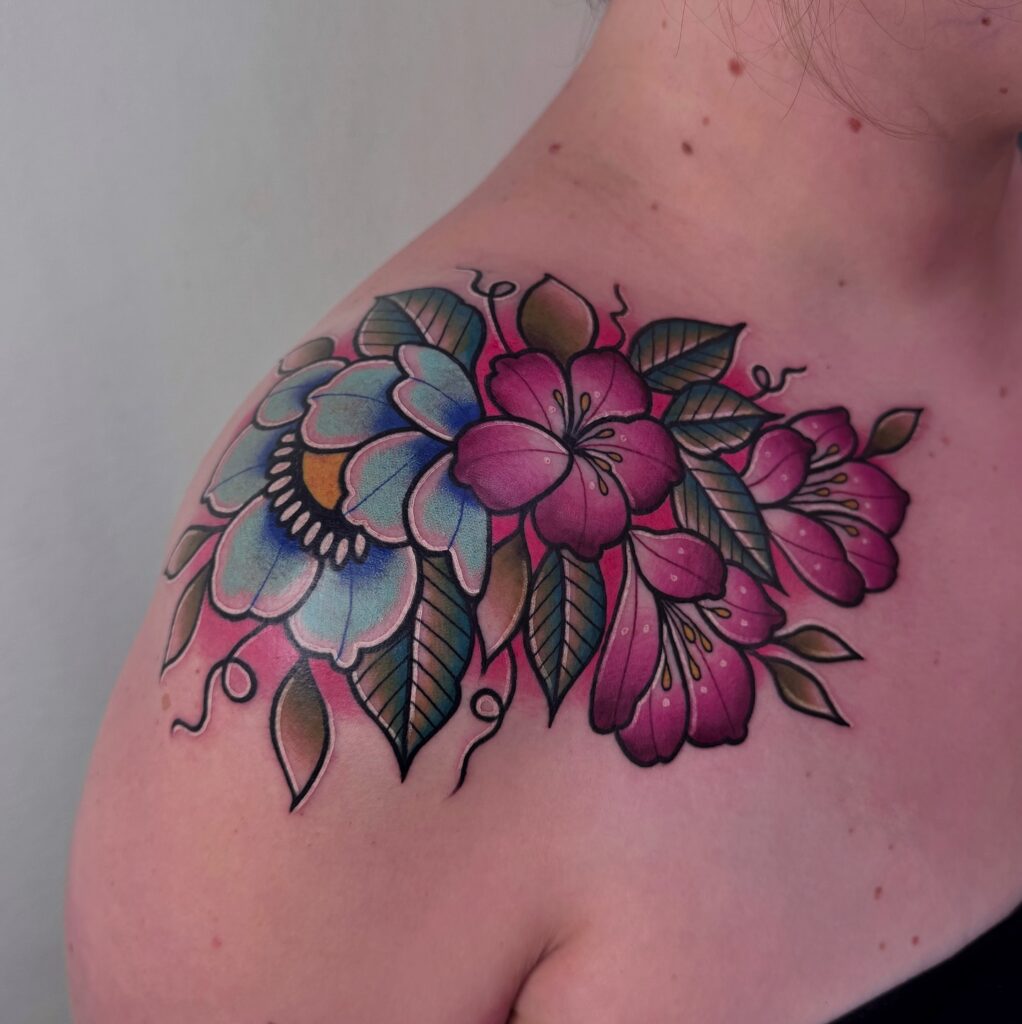 This vibrant floral tattoo uses bold outlines and bright pink, teal, and blue tones to create a cheerful, eye-catching design. The flowers are arranged to flow naturally over the curve of the shoulder, giving it a soft, feminine look.