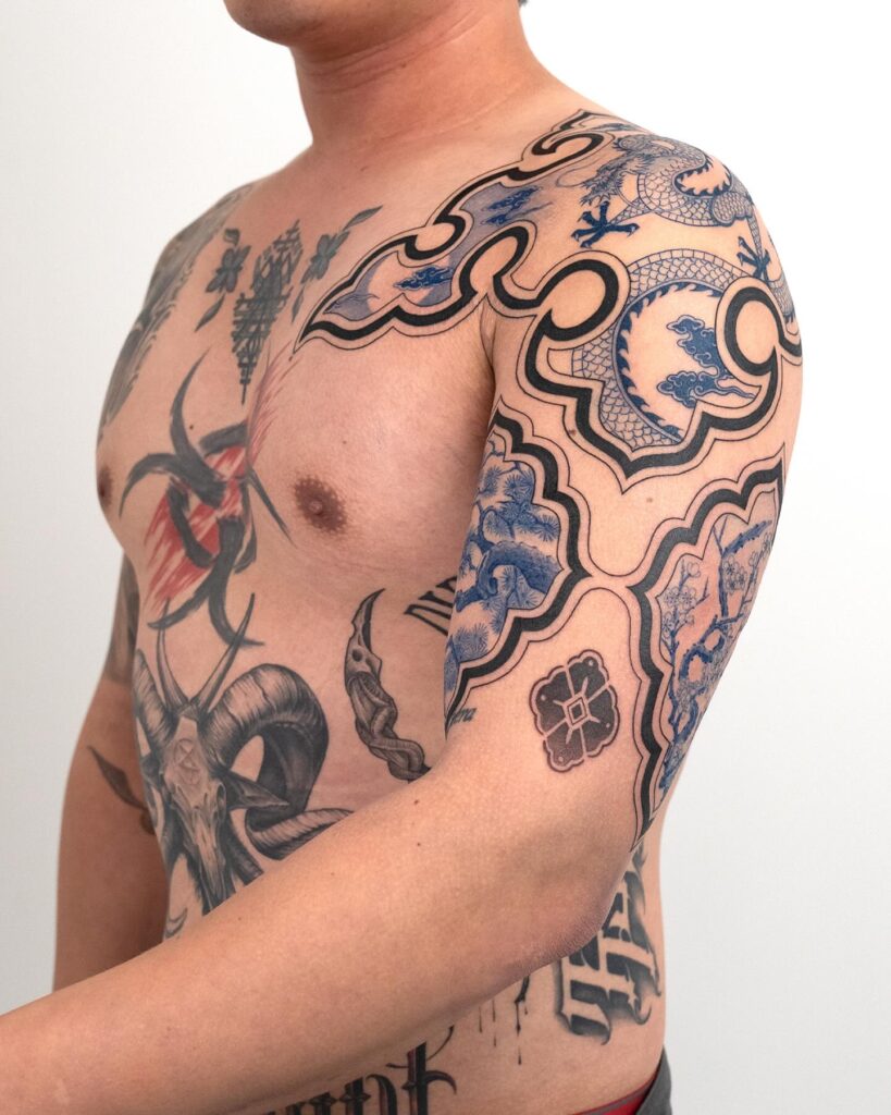 This unique shoulder tattoo looks like a blue-and-white porcelain artwork, featuring a detailed dragon framed by cloud-like patterns. The mix of bold outlines and intricate filler gives it a classic yet modern aesthetic.