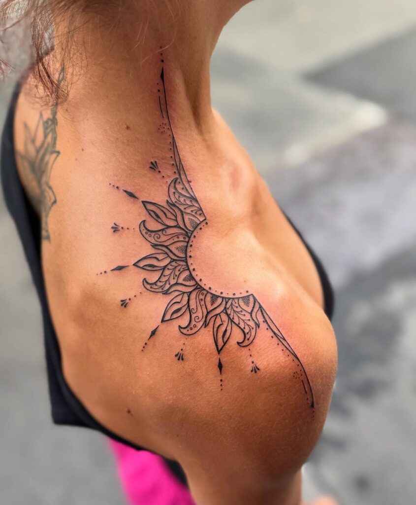This fine-line tattoo frames the shoulder with a sun-and-moon inspired mandala pattern, featuring delicate dotwork and ornamental arrows. Its elegant placement follows the natural curve of the collarbone, enhancing the shoulder’s shape.