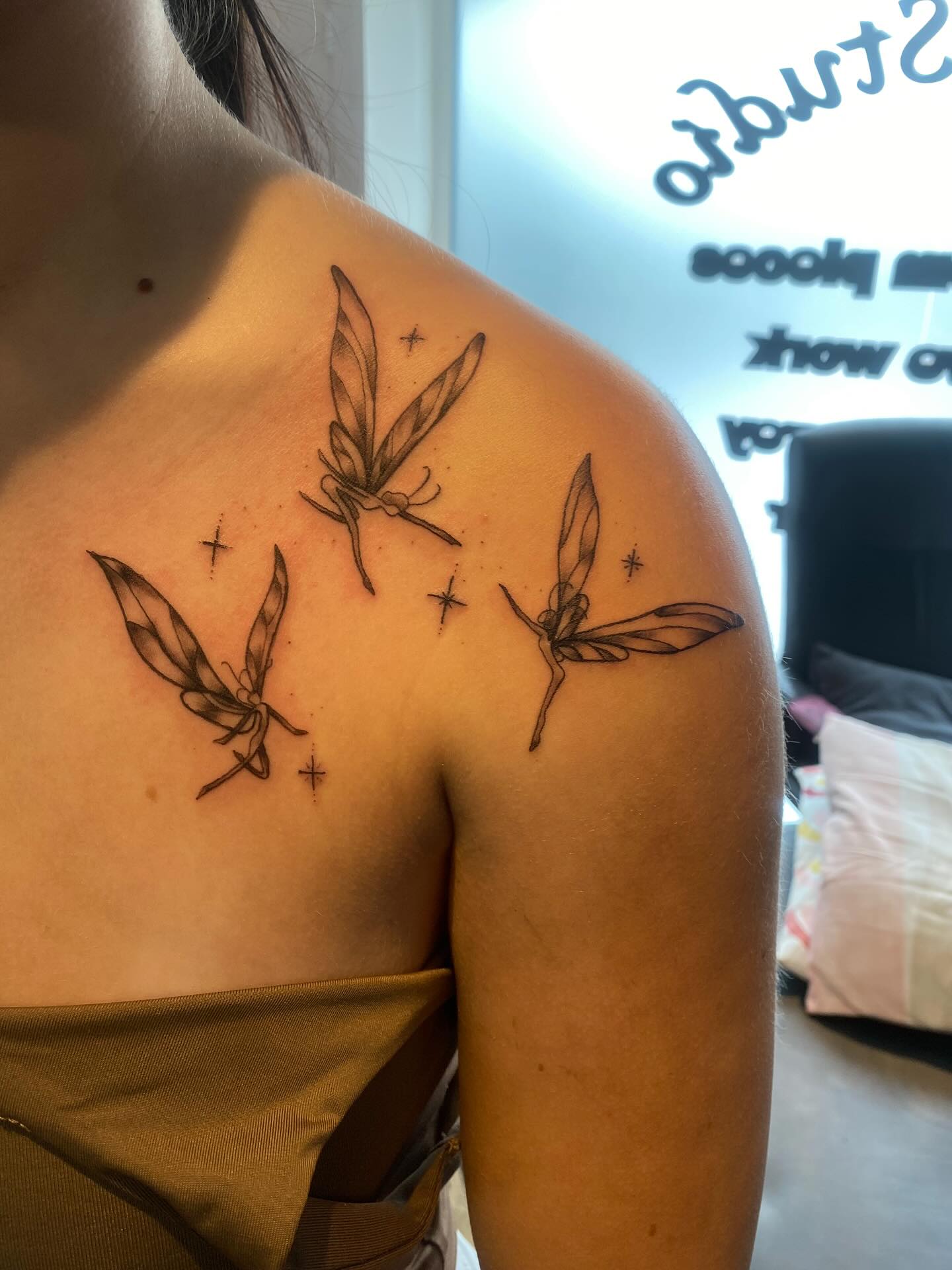 This ethereal design features three fine-line fairies with soft wings, surrounded by tiny sparkling stars. It has a light, airy feeling that gives the shoulder a magical, dreamy look.