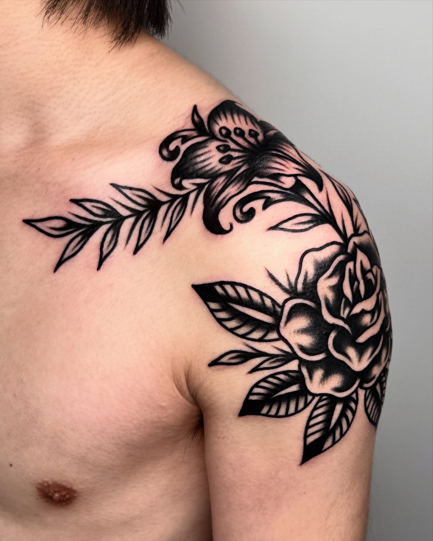 This floral design combines roses and lilies in solid blackwork, with smooth shading that makes the flowers appear bold and timeless. The composition spreads across the shoulder, emphasizing natural curves.