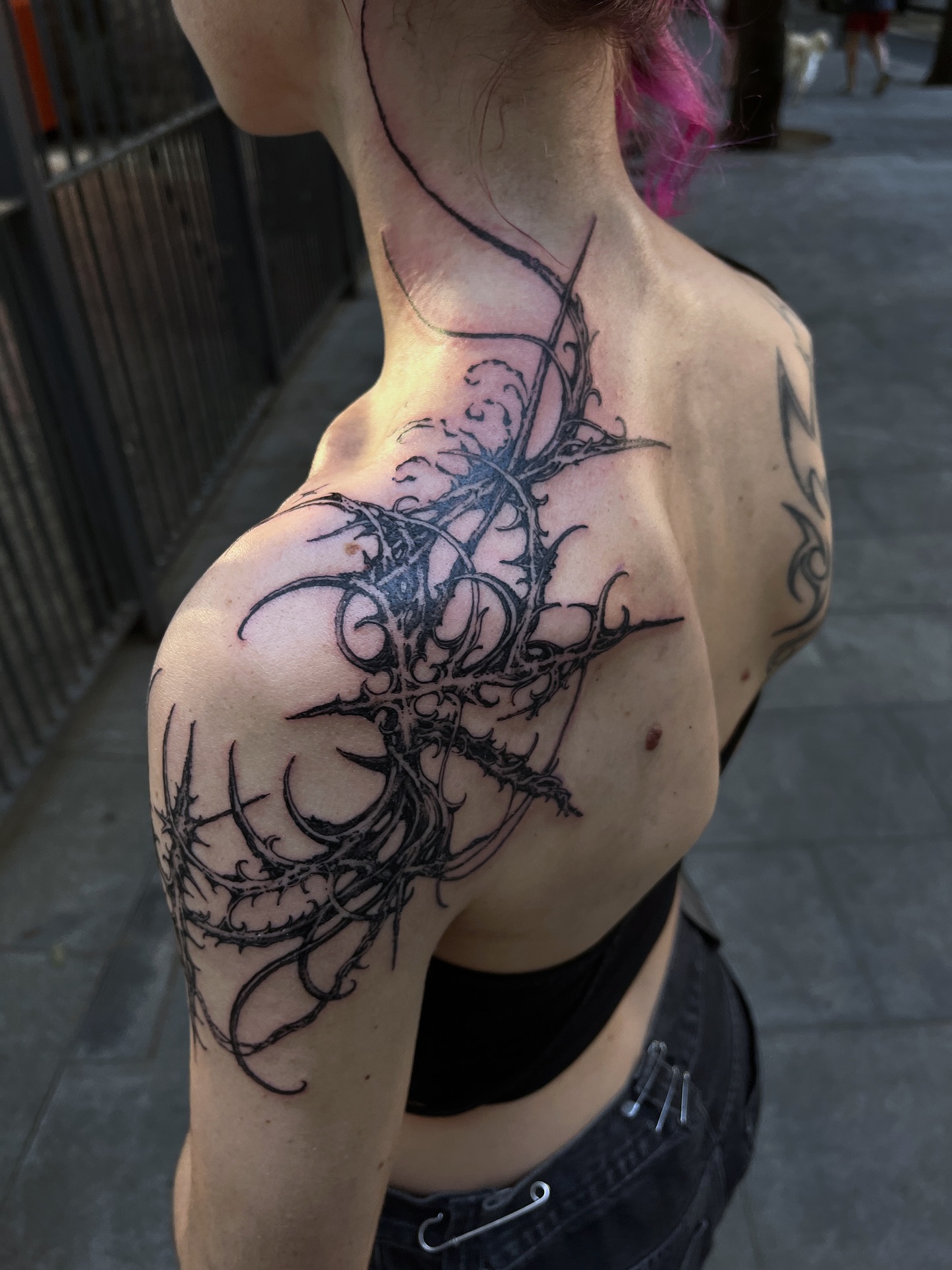 This tattoo uses dramatic, jagged lines and spiked shapes to create an abstract, biomechanical look across the shoulder and upper back. The dark shading and sharp edges give it a powerful, edgy vibe.