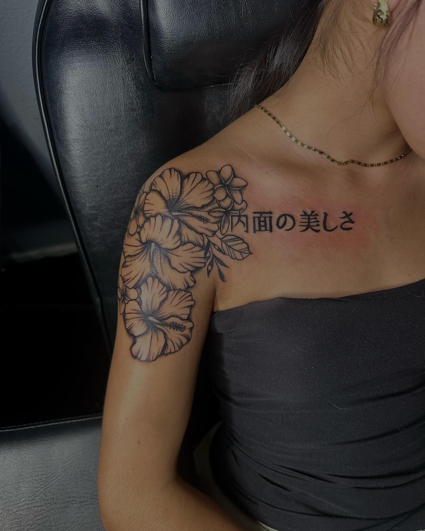This shoulder piece combines large, soft hibiscus flowers with Japanese script, creating a delicate yet meaningful design. The black-and-gray shading adds depth while keeping it subtle and classy.