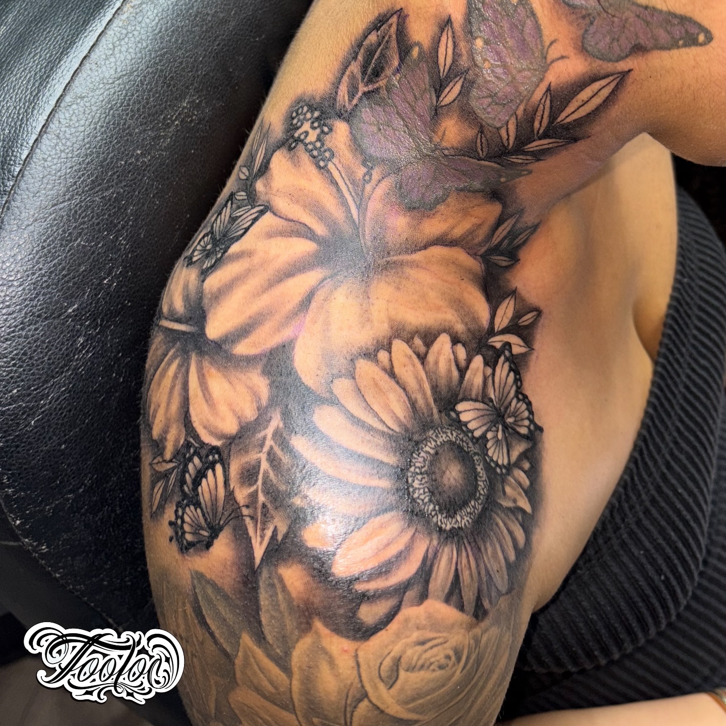 10. Black & Gray Floral and Butterfly Shoulder Tattoo