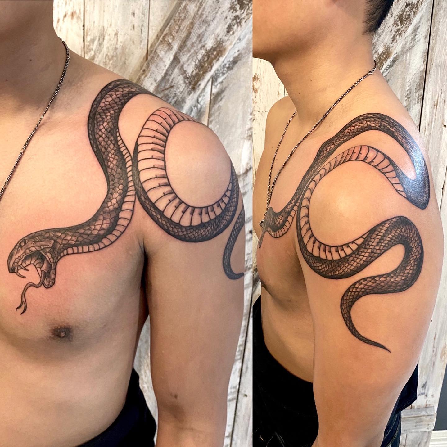 This dramatic blackwork snake tattoo slithers across the chest and shoulder, its body perfectly wrapping around the arm’s curve. The detailed scales and open-mouthed head give it a lifelike and powerful presence.