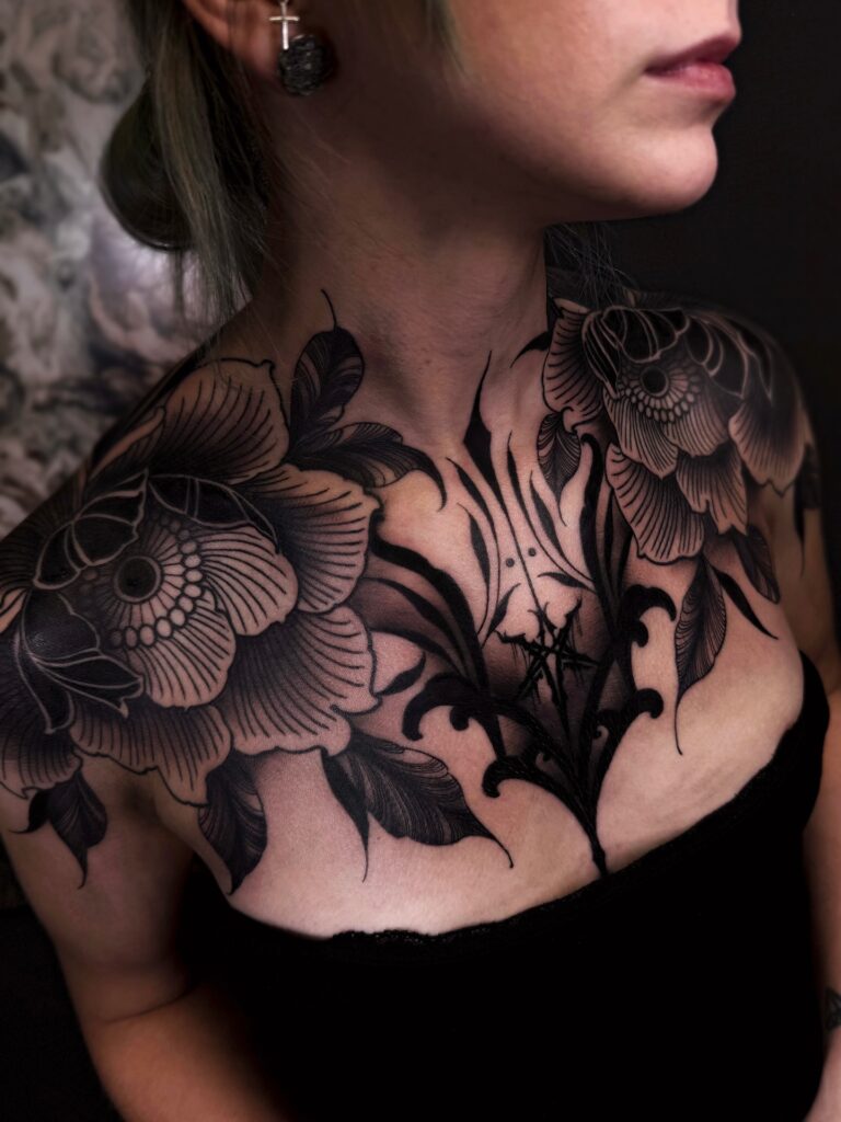 This large blackwork tattoo covers the shoulder and chest with dark, detailed flowers and leaves. The heavy shading and negative space create stunning contrast and drama.