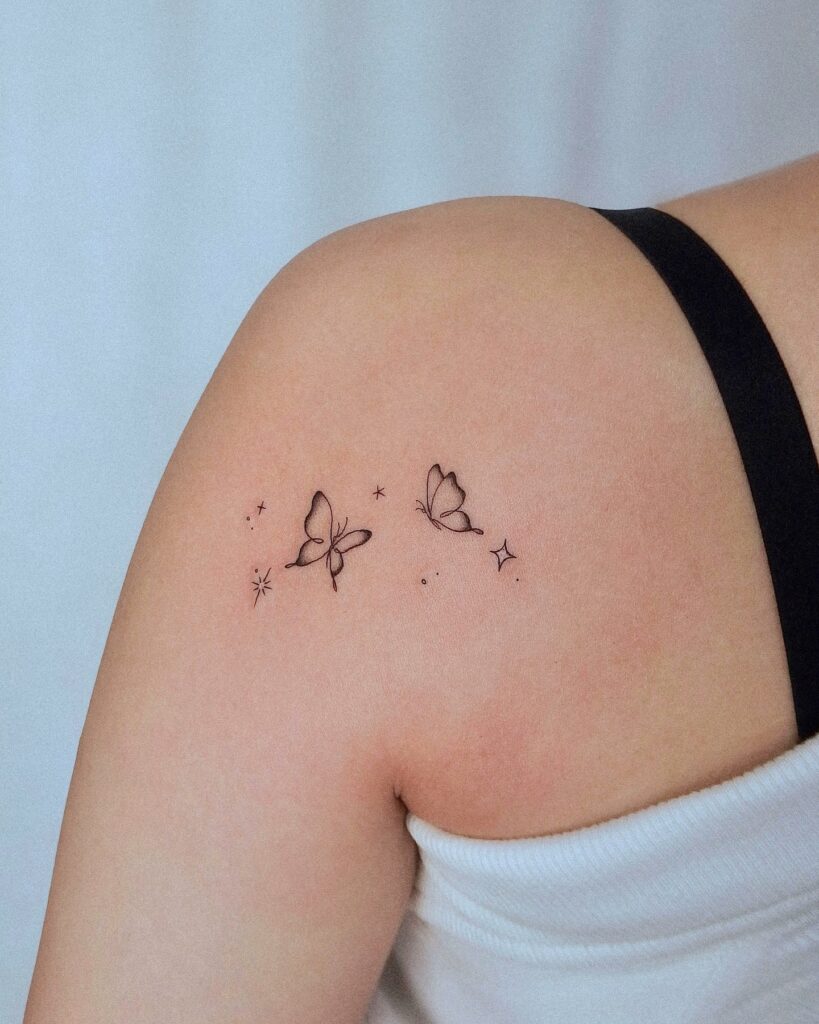 This delicate tattoo features two fine-line butterflies surrounded by tiny stars, placed softly on the shoulder. Its light, minimal style gives it a soft, feminine touch.
