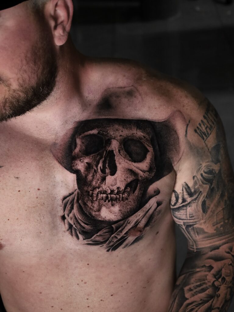 This striking chest tattoo shows a weathered skull wearing a cowboy hat and bandana, perfectly blending Western outlaw vibes with dark realism. The shading is bold, with heavy black around the eyes and hat, creating a moody, rugged look. It’s dramatic and commands attention as a centerpiece tattoo.
