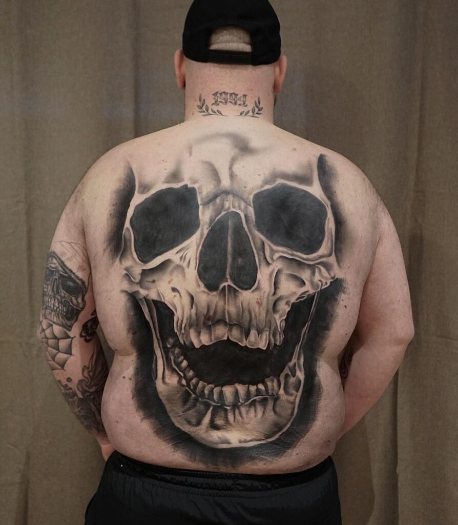 This back piece is a showstopper — a giant skull spanning the entire back with a menacing, open-mouthed expression. The dark shadows in the eye sockets create a haunting stare, while the detailed jawline gives the skull a sense of movement and intensity. It’s bold, intimidating, and impossible to ignore.