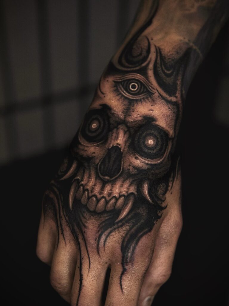 This unique hand tattoo blends a skull with a mystical twist — a third eye above the brow. The design uses heavy black shading and hypnotic circular detailing, giving it a surreal, almost spiritual feel. It’s dark, eerie, and beautifully mysterious, making the hand look like a portal to another dimension.