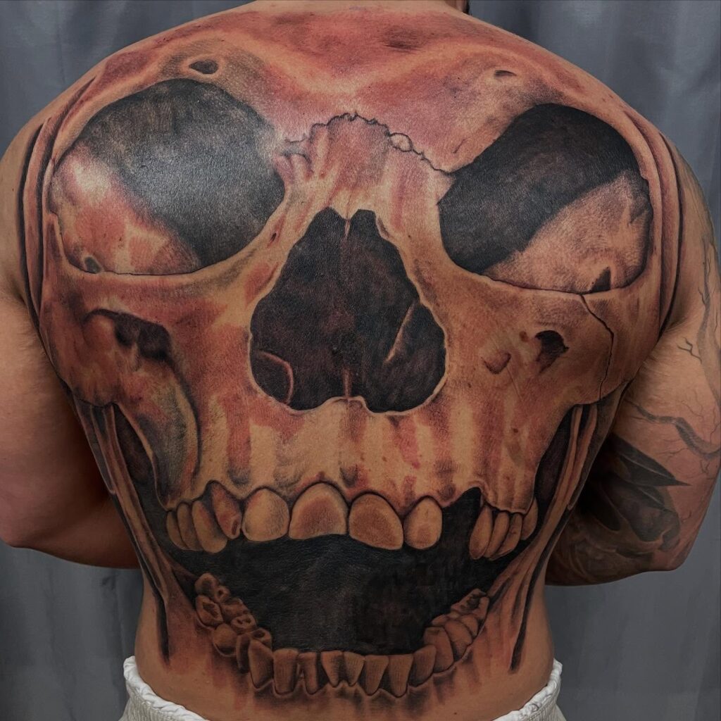 This bold back tattoo uses red and black ink to create a skull with a fiery, almost demonic look. The warm tones give the skull an intense, burning presence that contrasts against the skin. It’s dramatic, powerful, and visually striking.