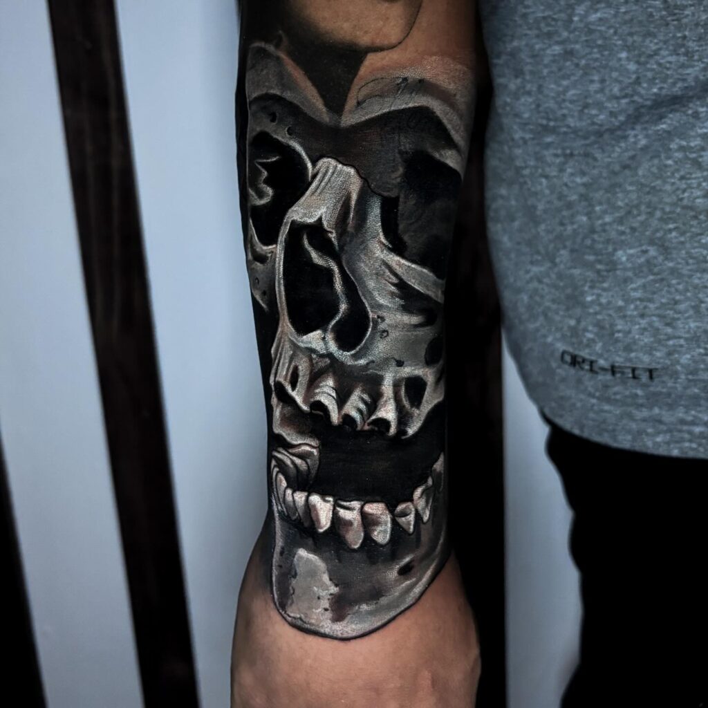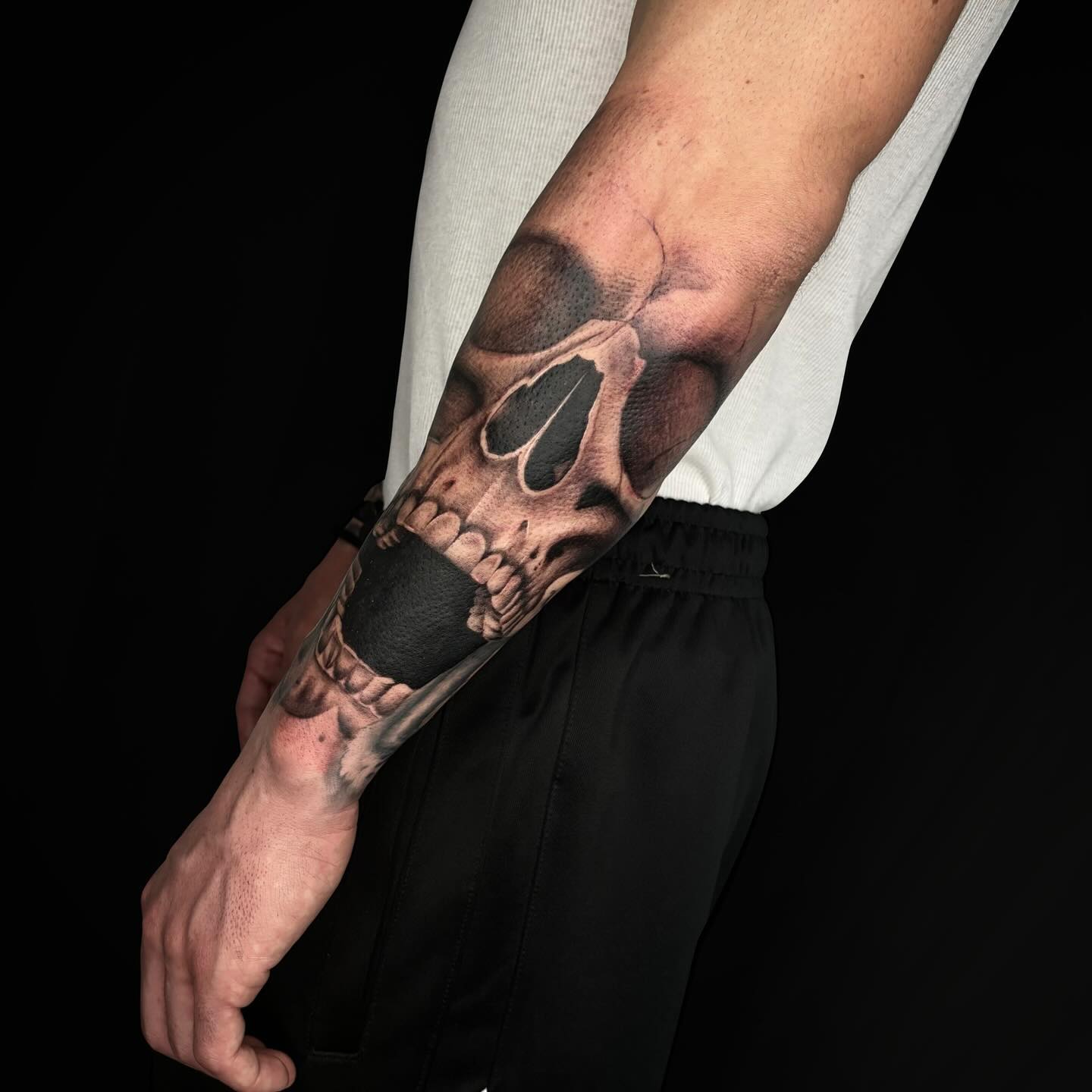 This forearm tattoo stretches a large skull design from wrist to elbow, giving the illusion that the bone structure is wrapping around the arm. Deep black fills create contrast in the eye sockets and jaw, while soft shading builds realistic dimension and texture. It’s bold, clean, and very modern in style.