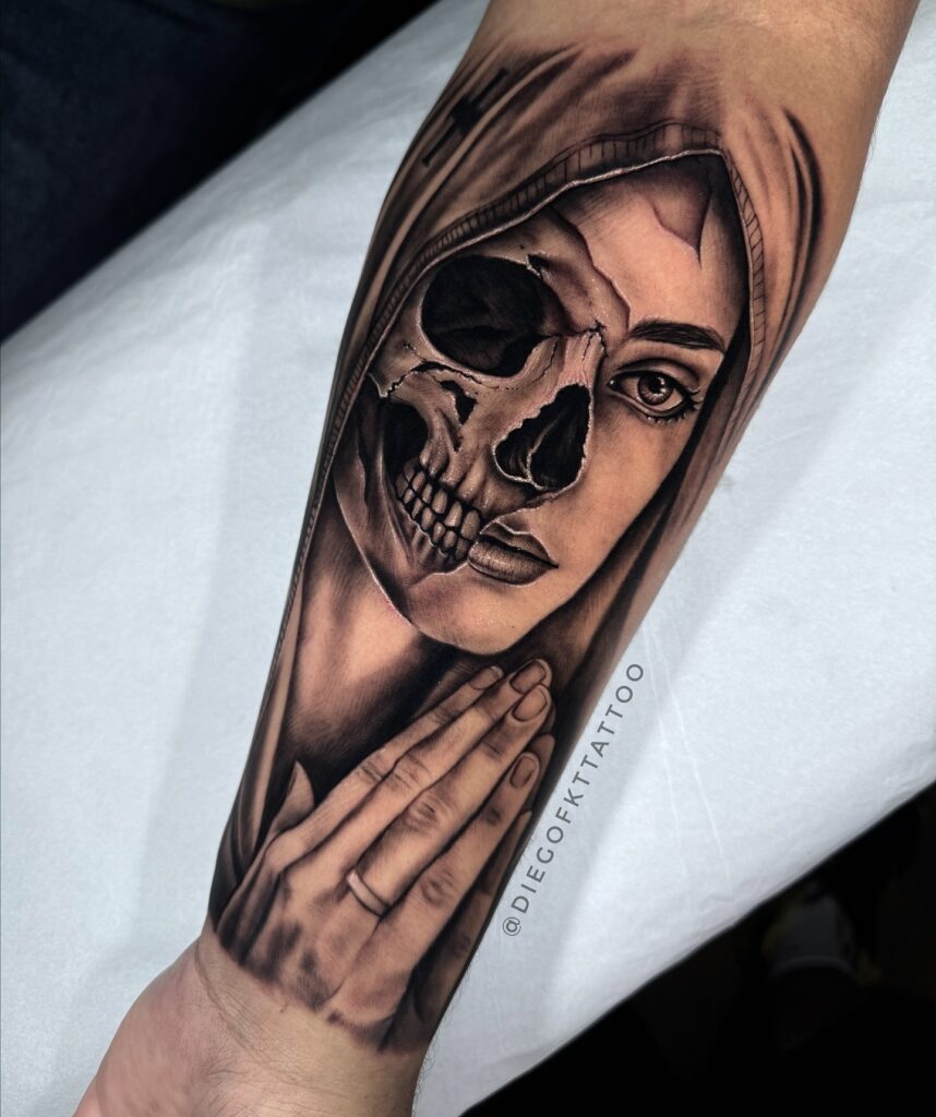This forearm tattoo fuses two worlds: one side a detailed woman’s face, the other a skull, creating a powerful contrast between life and death. The shading is smooth and realistic, making the transition between flesh and bone seamless.