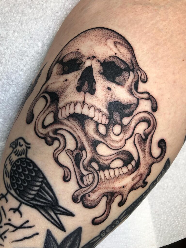 This tattoo takes a creative approach, showing a skull melting and dripping apart in a surreal, almost liquid style. The dotwork shading gives it texture and depth, making the design look like it’s dissolving into the skin.