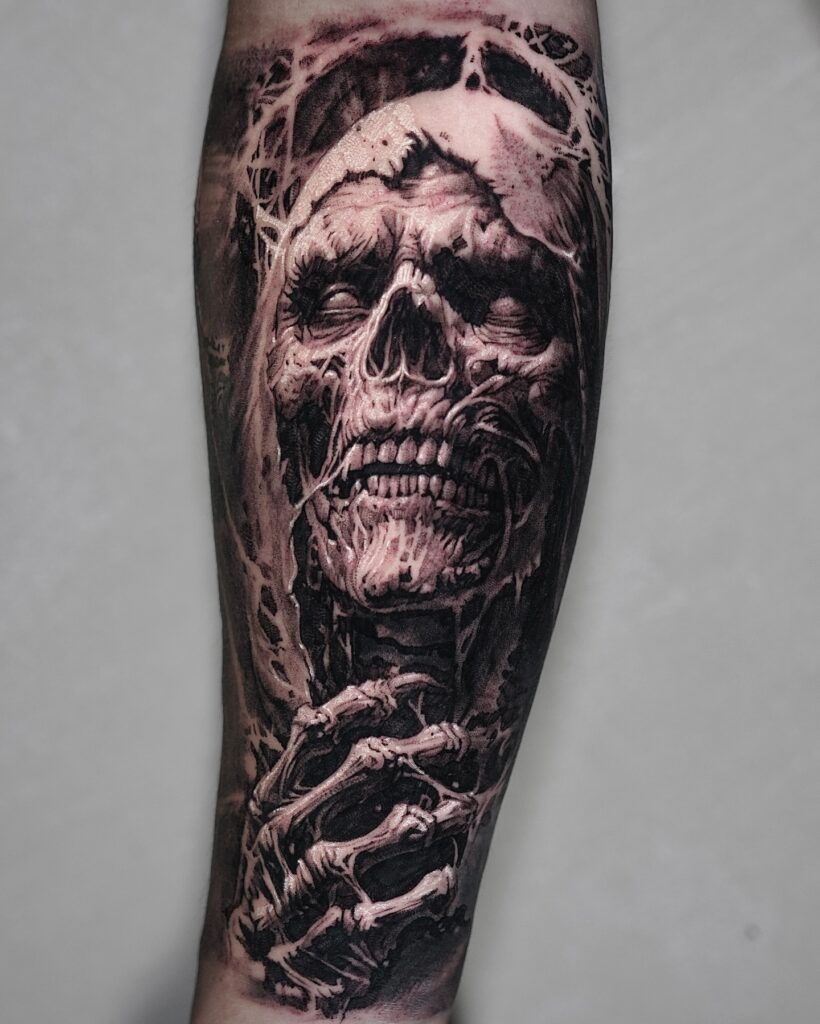 This forearm tattoo depicts a decomposed skull with exposed teeth and sunken eyes, surrounded by web-like textures. The bony hands are clasped together, giving it an almost praying or pleading gesture. The black-and-gray work is intricate, giving it a dark horror-inspired look.