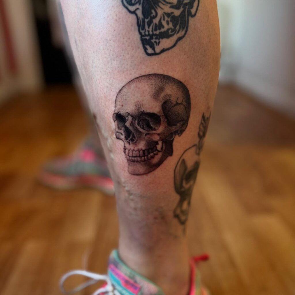 This tattoo features a perfectly detailed human skull rendered in smooth black and gray shading, placed neatly on the calf. The artist captured the hollows of the eyes and nasal cavity with soft gradients, giving it depth and dimension. Its clean lines and subtle shading make it look like a classic anatomical sketch brought to life.