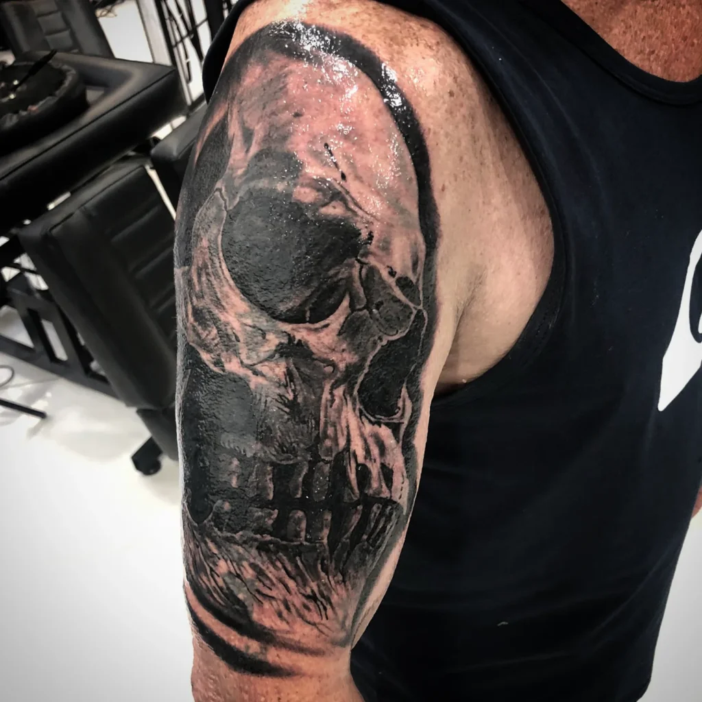 This shoulder tattoo features a dark, shadowy skull design that wraps around the upper arm. Heavy black ink creates a bold silhouette, while careful highlights add realism and depth. It feels raw and gritty, perfect for someone who loves dark, mysterious artwork.