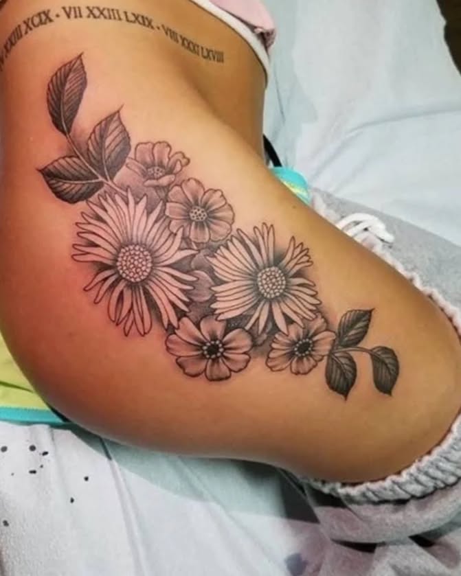 This large floral piece flows beautifully across the hip, combining sunflowers with complementary blooms for a soft, elegant look. The black and grey shading adds depth and realism, while maintaining a timeless aesthetic that pairs well with other tattoos.