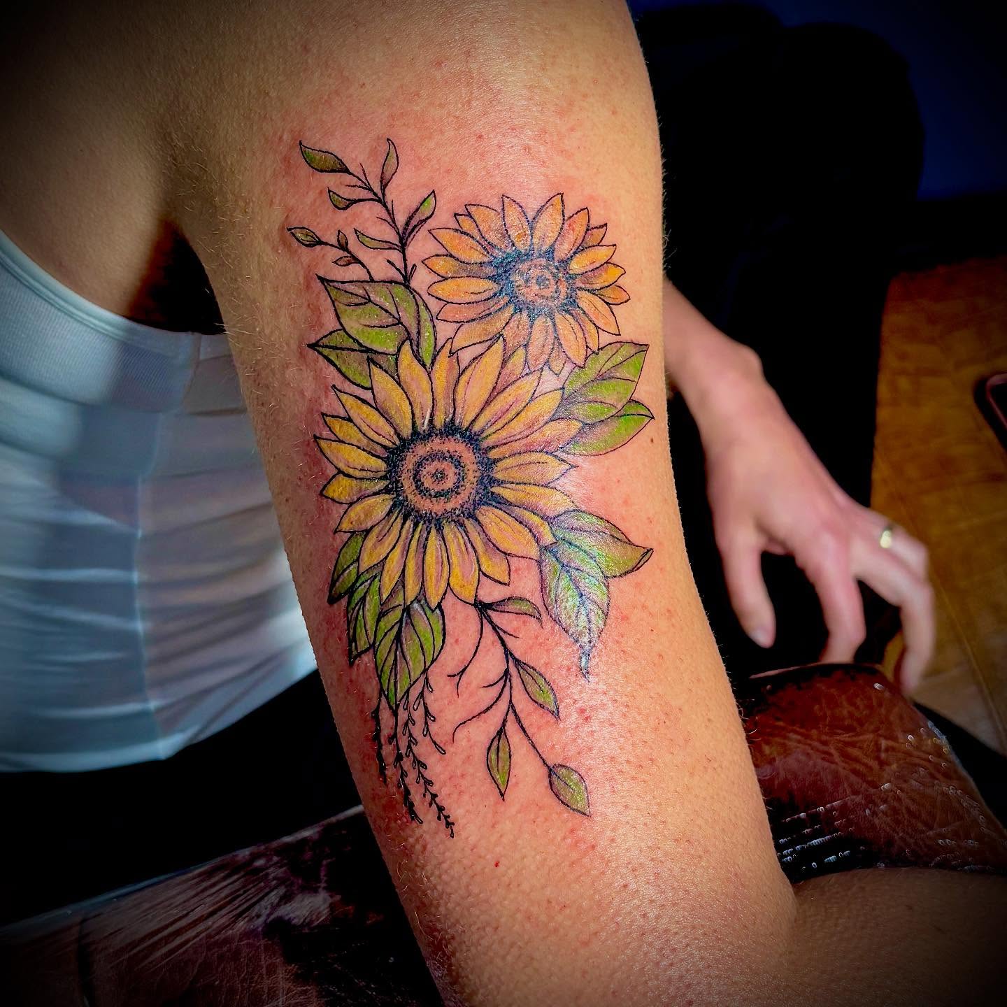This tattoo features two vibrant sunflowers surrounded by delicate green leaves, creating a lively and natural arrangement. The mix of yellow petals and fine black outlines makes the design pop against the skin, giving it a fresh and cheerful energy.