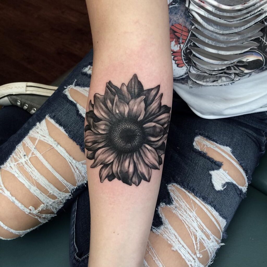 4. Realistic Black & Grey Sunflower Forearm Tattoo