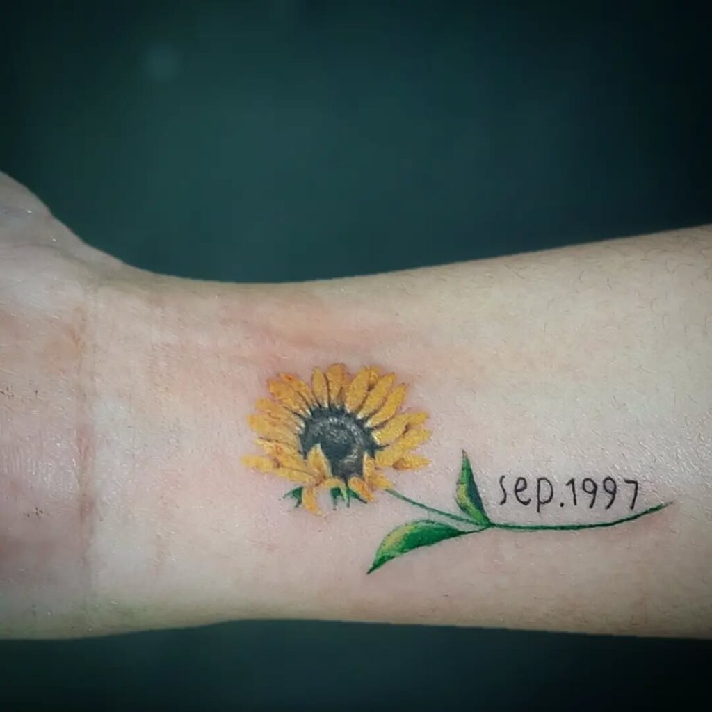 This simple yet meaningful tattoo features a small sunflower with delicate yellow petals and a green stem, paired with a date. The soft colors make it sweet and subtle, perfect for a sentimental memory or milestone.