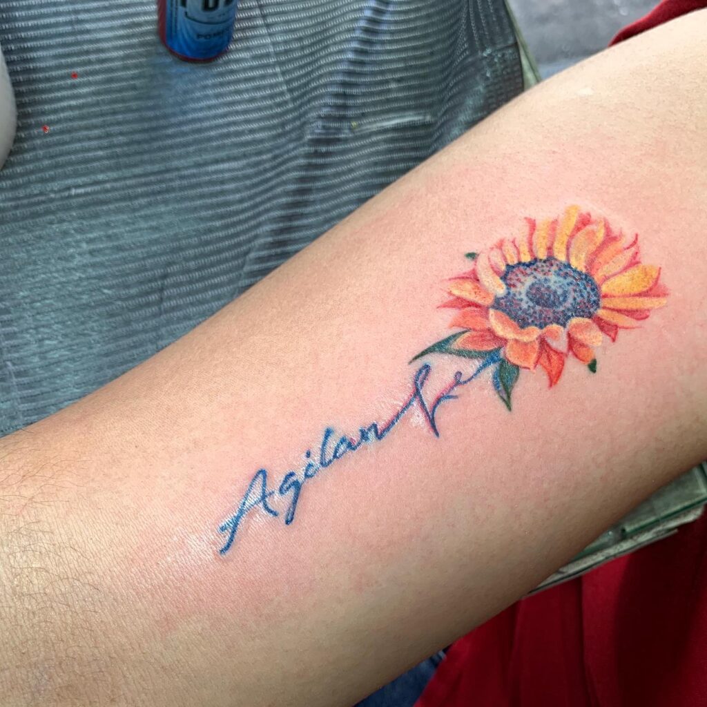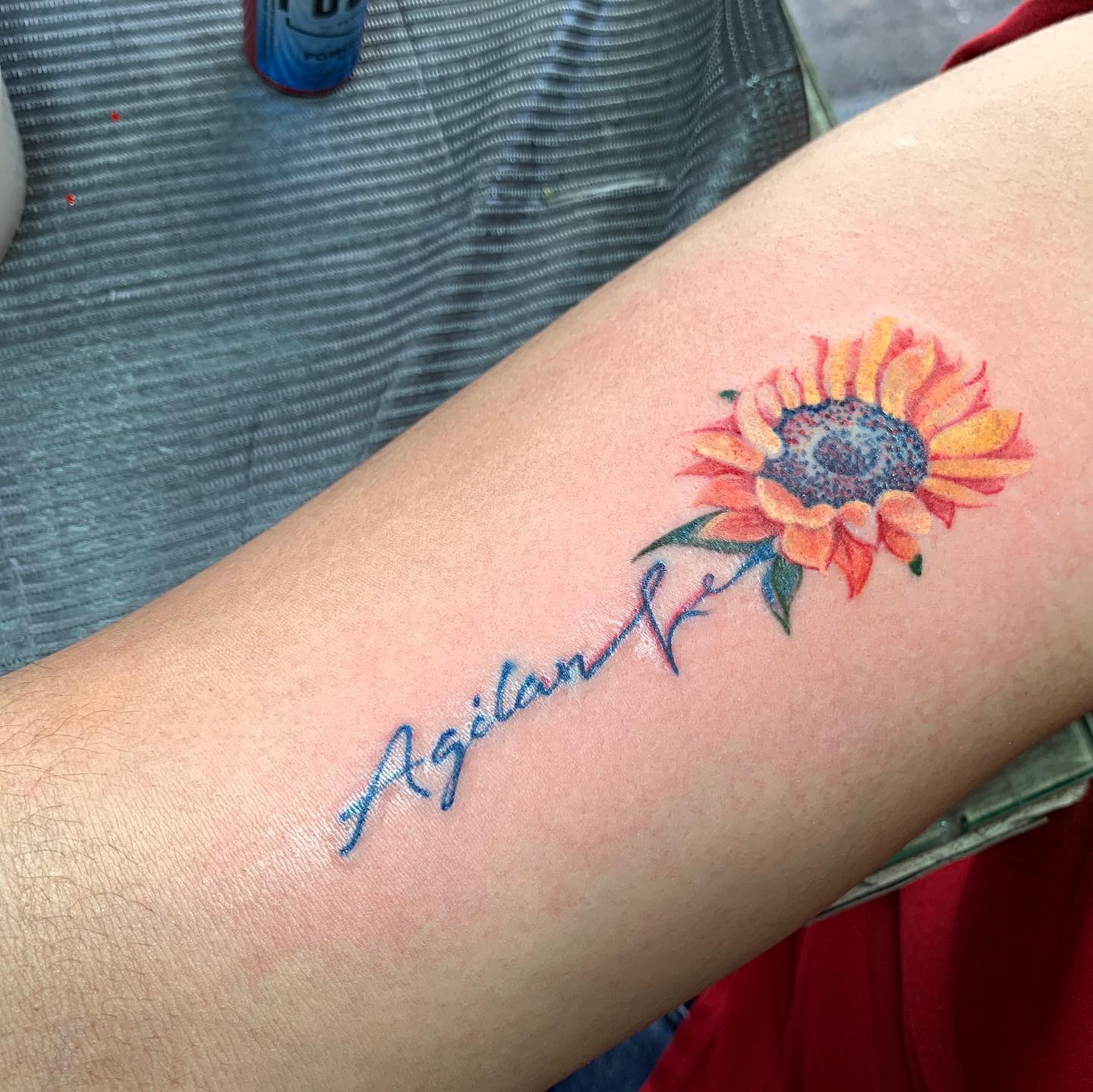 This colorful sunflower is paired with a handwritten name in a smooth, flowing script, making the tattoo deeply personal. The orange and yellow petals bring brightness to the design, while the blue ink of the name creates a striking contrast.