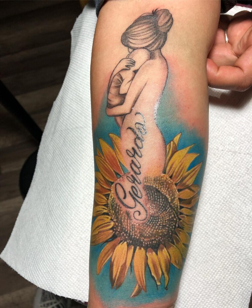 This stunning design depicts a mother embracing her child, framed by a bright sunflower and set against a vibrant blue background. The detailed shading and warm tones make this tattoo feel alive and full of love.