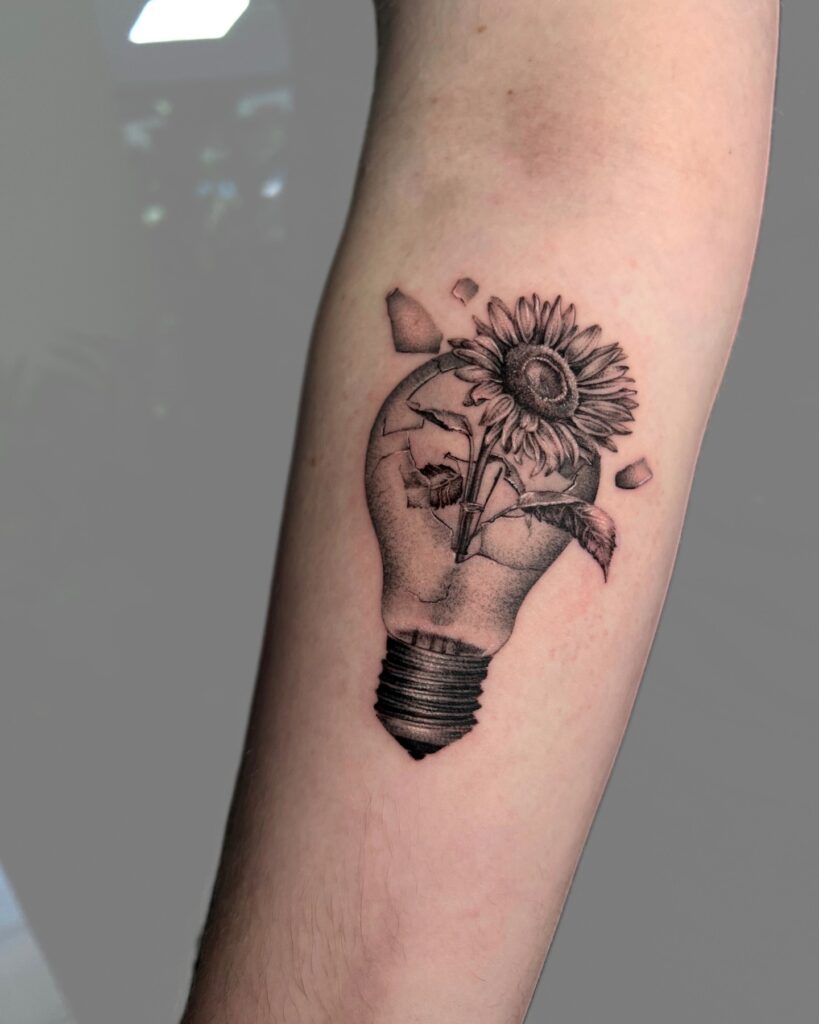 This unique design features a sunflower growing inside a broken light bulb, creating a symbolic image of hope and new ideas emerging from brokenness. The black and grey shading gives it a dramatic and detailed look.