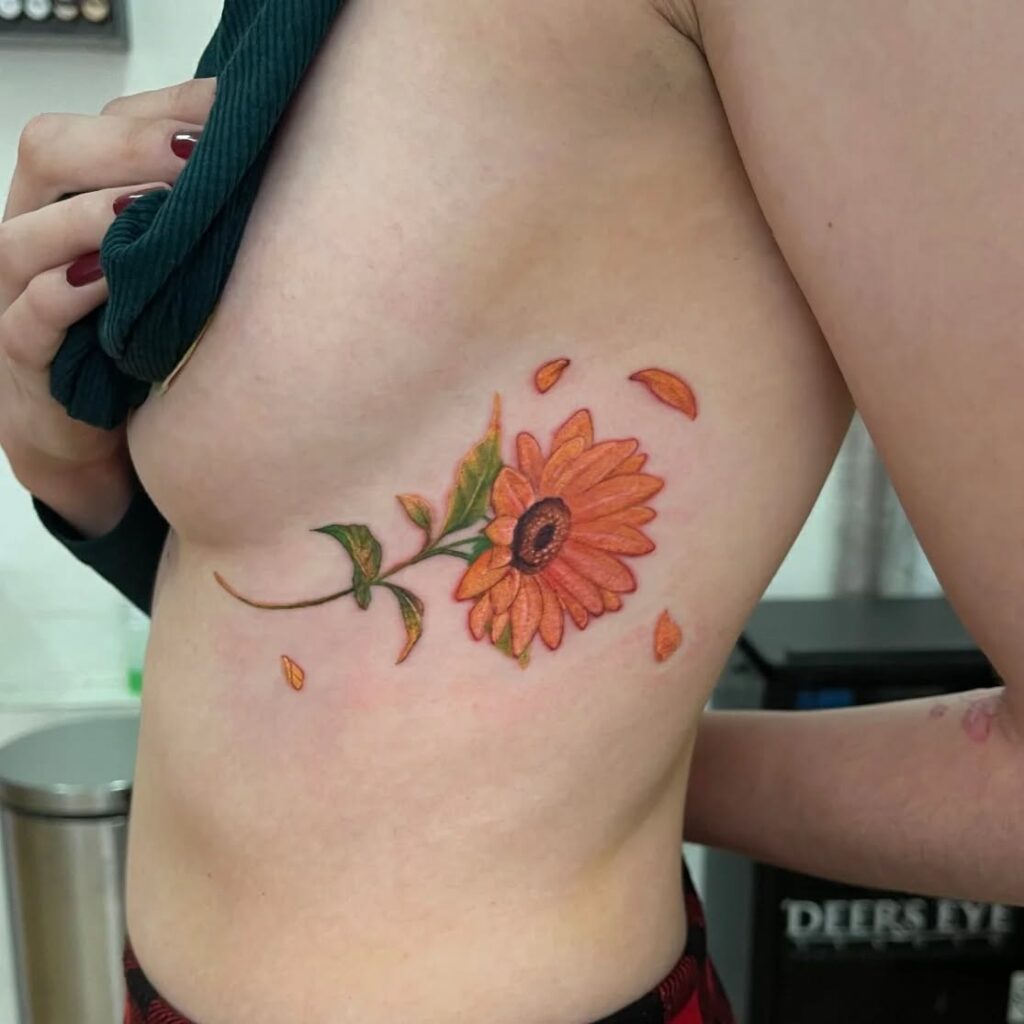 Placed along the ribcage, this tattoo features a single orange sunflower with a few petals gracefully falling away. The placement emphasizes the natural curve of the body, giving it a delicate and artistic feel.