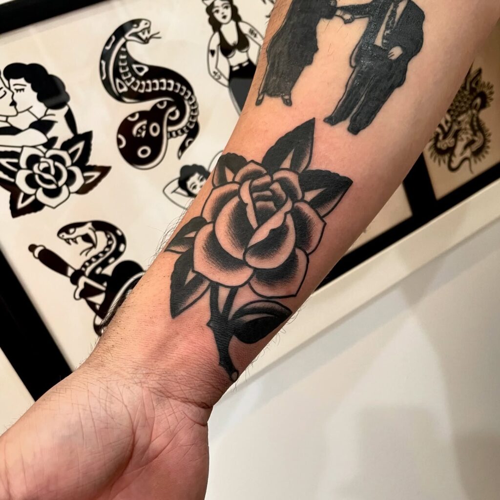 This classic forearm piece uses solid black shading and thick outlines to create a bold, traditional-style rose. The petals are shaded to give a smooth gradient, making the flower pop while staying true to the timeless old-school look.