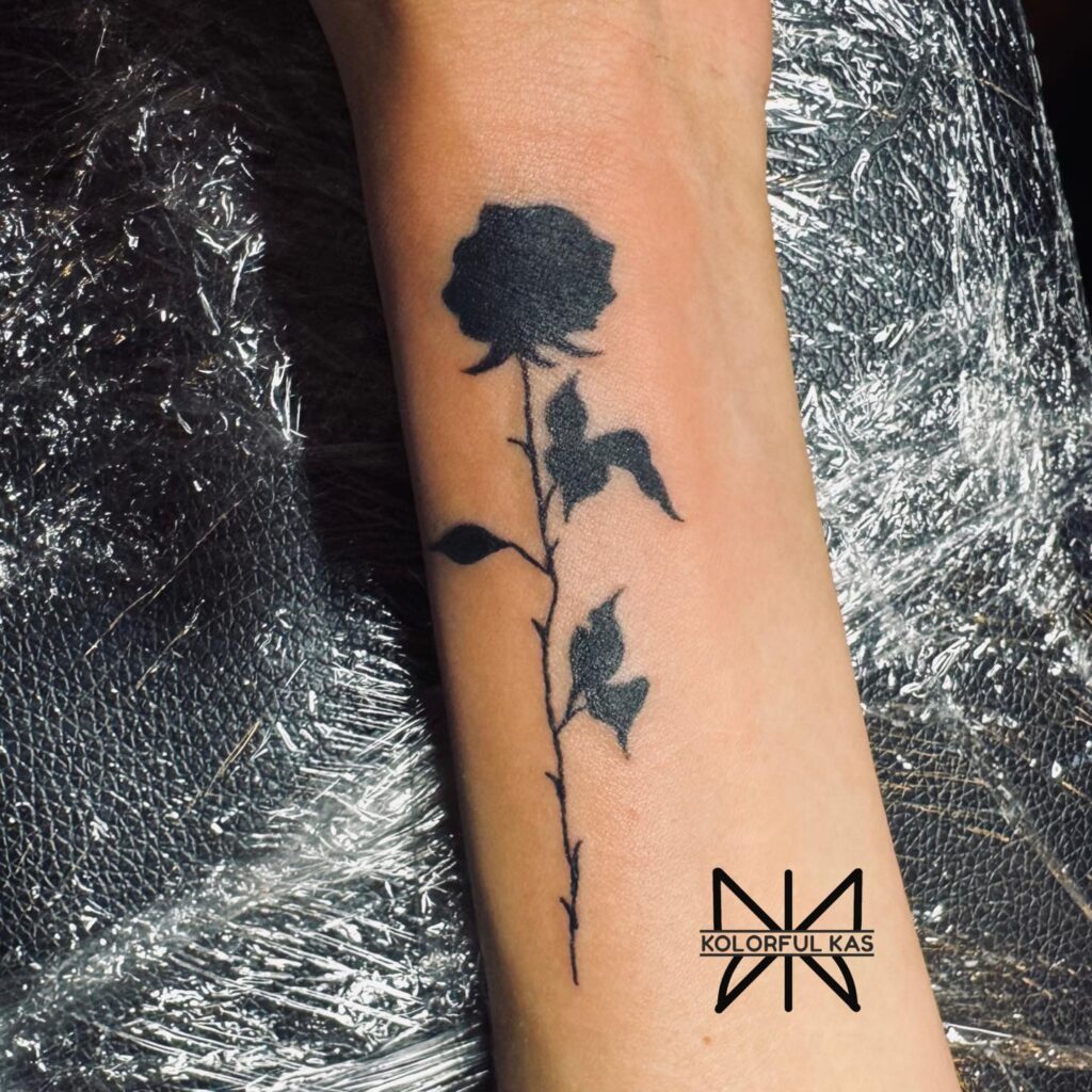 This design features a fully blacked-out rose with a long stem and leaves, giving it a sleek and elegant look. The negative space creates a strong visual impact, making it stand out without needing extra detail.