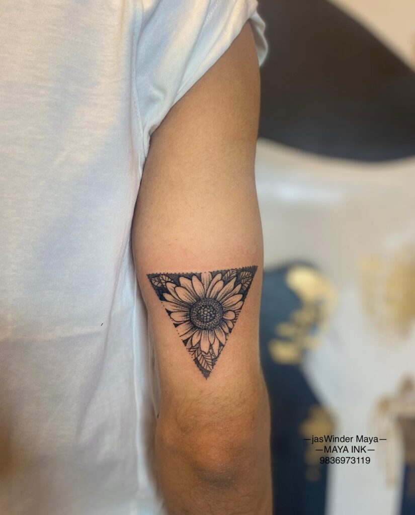 This striking design places a detailed sunflower within a perfectly balanced inverted triangle, creating a modern and bold look. The dark shading inside the triangle beautifully contrasts with the petals, giving the tattoo a sense of depth and dimension.