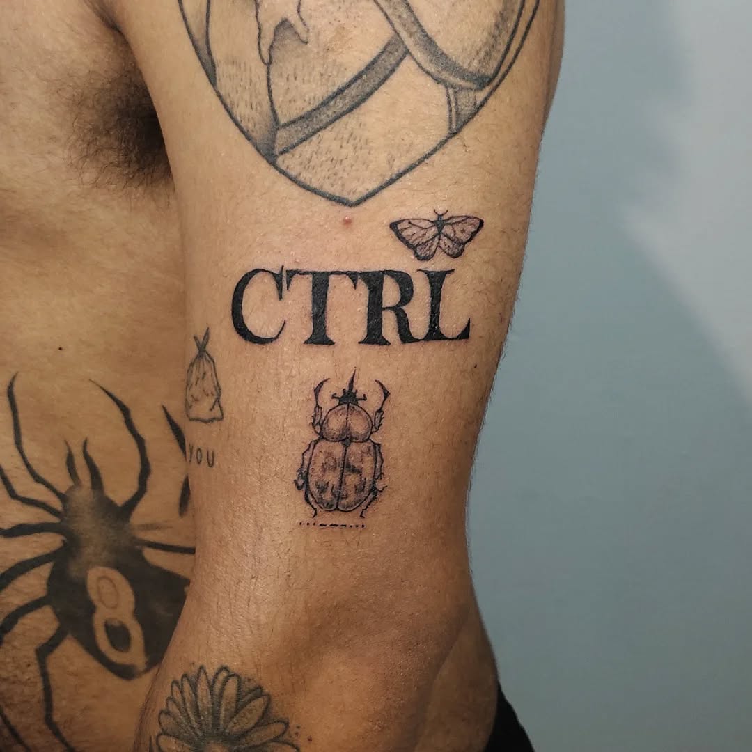 - Description: This bold lettering tattoo featuring “CTRL” in a striking serif font is a powerful homage to SZA’s transformative album. Accompanied by a beetle and a moth, the tattoo carries deep symbolism—representing resilience, renewal, and light amidst darkness. The combination of bold typography and delicate insect details makes this an artistic yet powerful piece. Ideal for placement on the bicep or forearm, this tattoo is perfect for those who connect with the themes of Ctrl and want a statement piece that merges aesthetics with meaning.