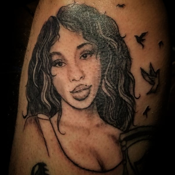 - Description: This stunning black-and-grey portrait tattoo captures SZA in a lifelike, highly detailed way. Her expressive eyes, flowing curls, and natural beauty are beautifully illustrated, making this a true work of art. The inclusion of small birds flying nearby adds a symbolic touch, representing freedom, transformation, and artistic spirit. This tattoo is ideal for superfans who want a bold, striking tribute to SZA’s influence in music and culture. The level of realism makes it a captivating, eye-catching design, perfect for placement on the thigh or forearm.
