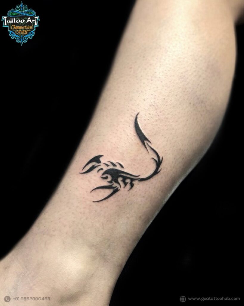 This tattoo captures the essence of a scorpion in sleek, tribal-inspired lines. The design is bold yet minimal, using sharp black strokes to represent the creature’s pincers, legs, and stinger without overwhelming detail. Its compact size makes it perfect for those who prefer subtlety while still showcasing strength and protection.