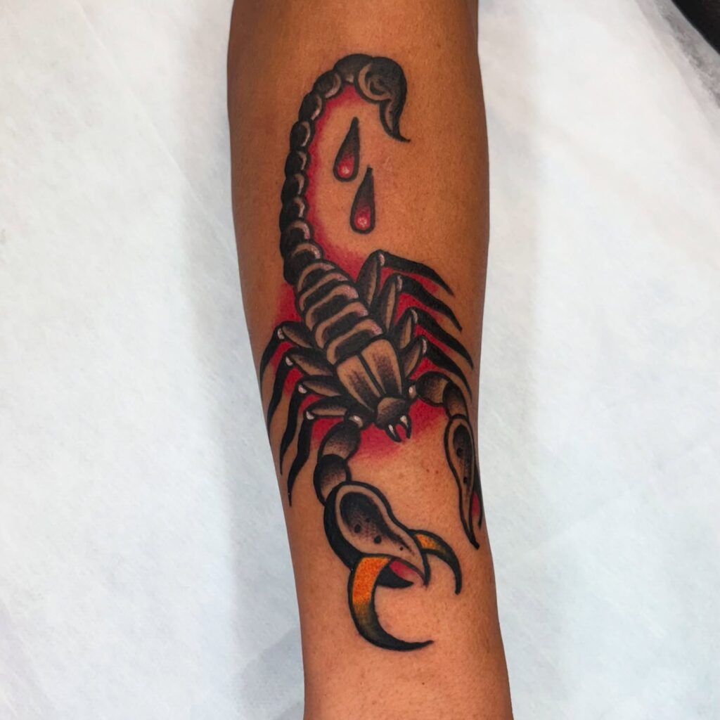 This tattoo embraces classic style with bold lines, heavy black shading, and vivid red details. Positioned on the forearm, the scorpion looks fierce and powerful, its raised stinger dripping with stylized blood drops.