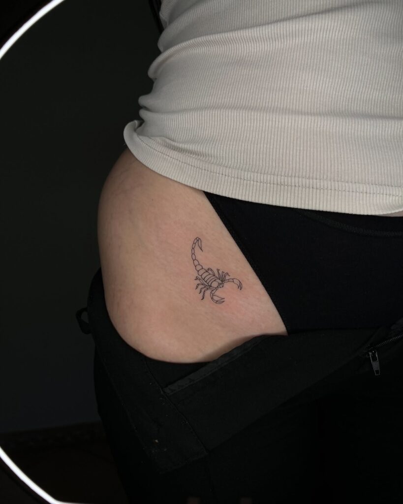 Positioned gracefully on the hip, this tattoo uses fine shading to create a detailed scorpion design that blends elegance with power. The curved tail and sharp claws are depicted with precision, enhancing the creature’s natural intensity. Hip tattoos are known for their sensual placement, making this piece both alluring and deeply symbolic.