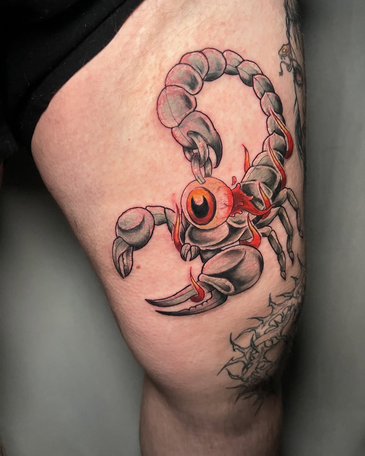 This striking thigh tattoo transforms the scorpion into a surreal masterpiece. The creature’s body and claws are rendered with bold outlines and grey shading, while the centerpiece—a vivid red eye—replaces its head, giving the design a unique, otherworldly appeal. Red accents across the stinger and body add intensity, making the tattoo visually explosive.