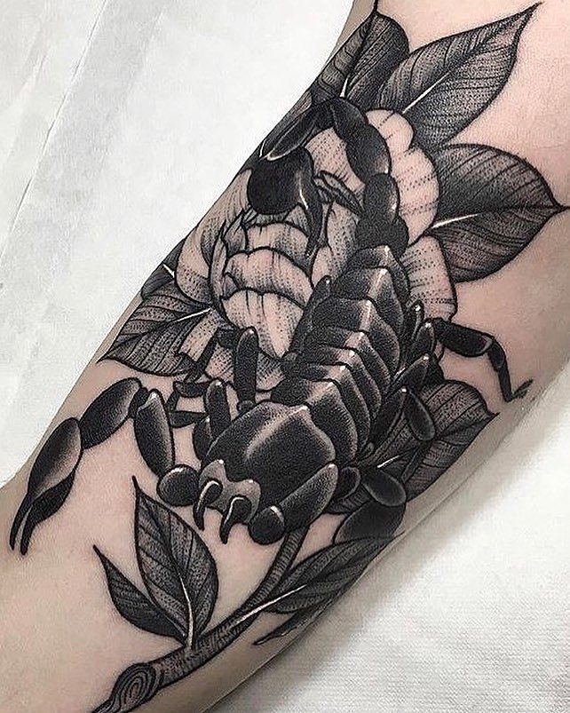 This tattoo showcases incredible realism, bringing the scorpion to life with meticulous shading and texture. The deep blacks and subtle highlights give it a three-dimensional effect, making it look as if the creature is crawling across the skin.
