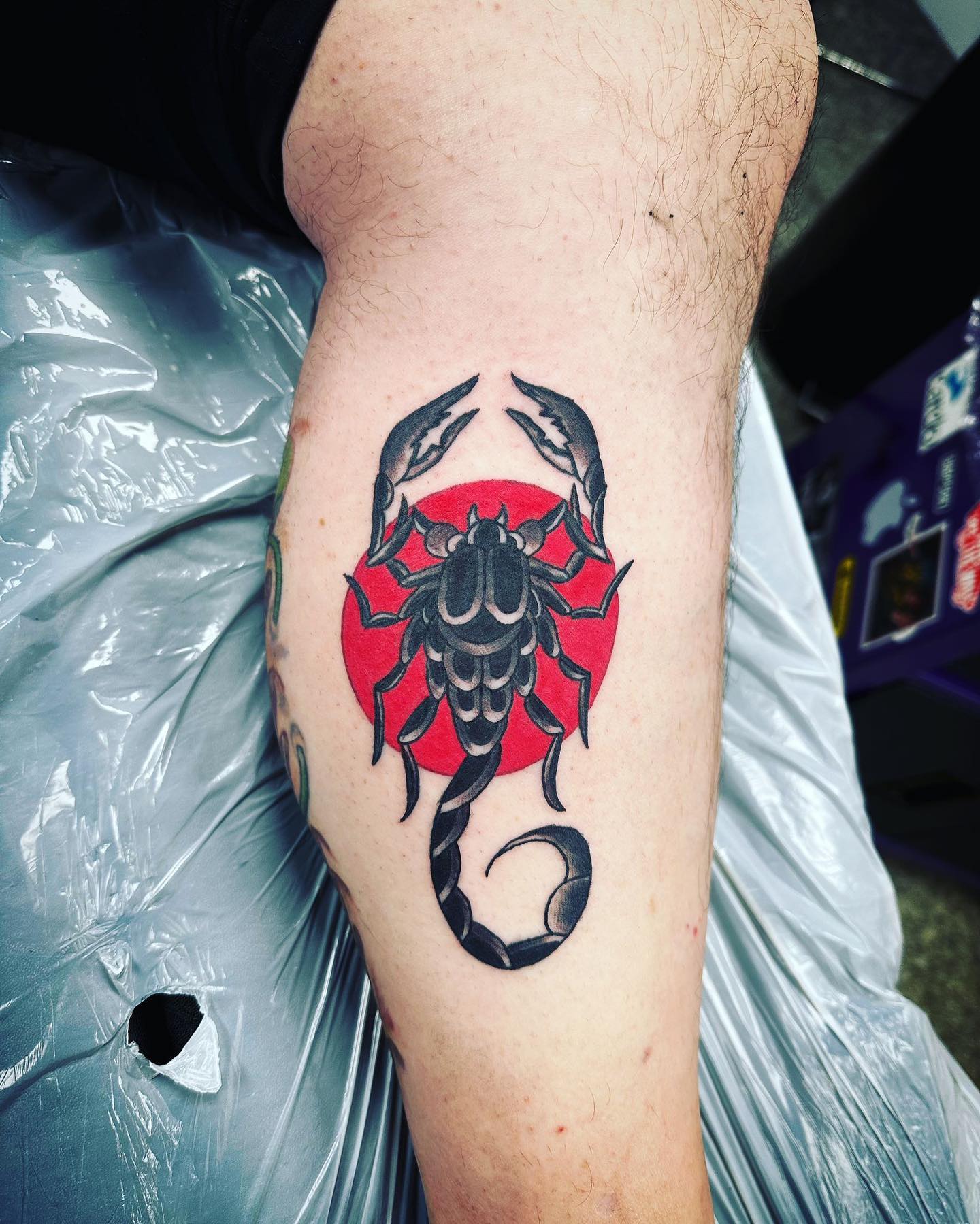 This tattoo fuses bold traditional style with symbolic imagery. The black scorpion is inked in thick lines and solid shading, set dramatically against a bright red circular background resembling the sun. The design’s symmetry and boldness make it eye-catching and timeless.