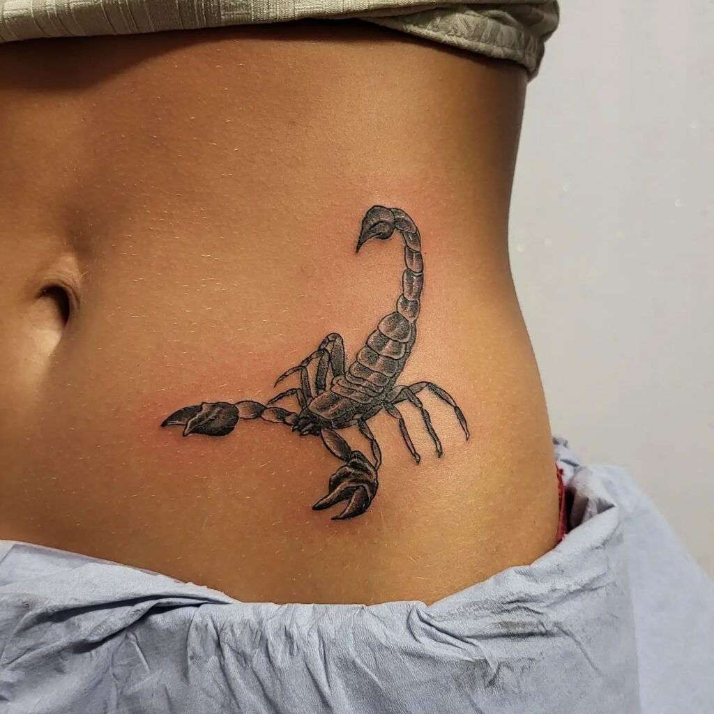 This tattoo, placed prominently on the side of the stomach, combines bold black ink and detailed shading to create a striking design. The scorpion’s claws and segmented tail are meticulously drawn, emphasizing its fierce nature.