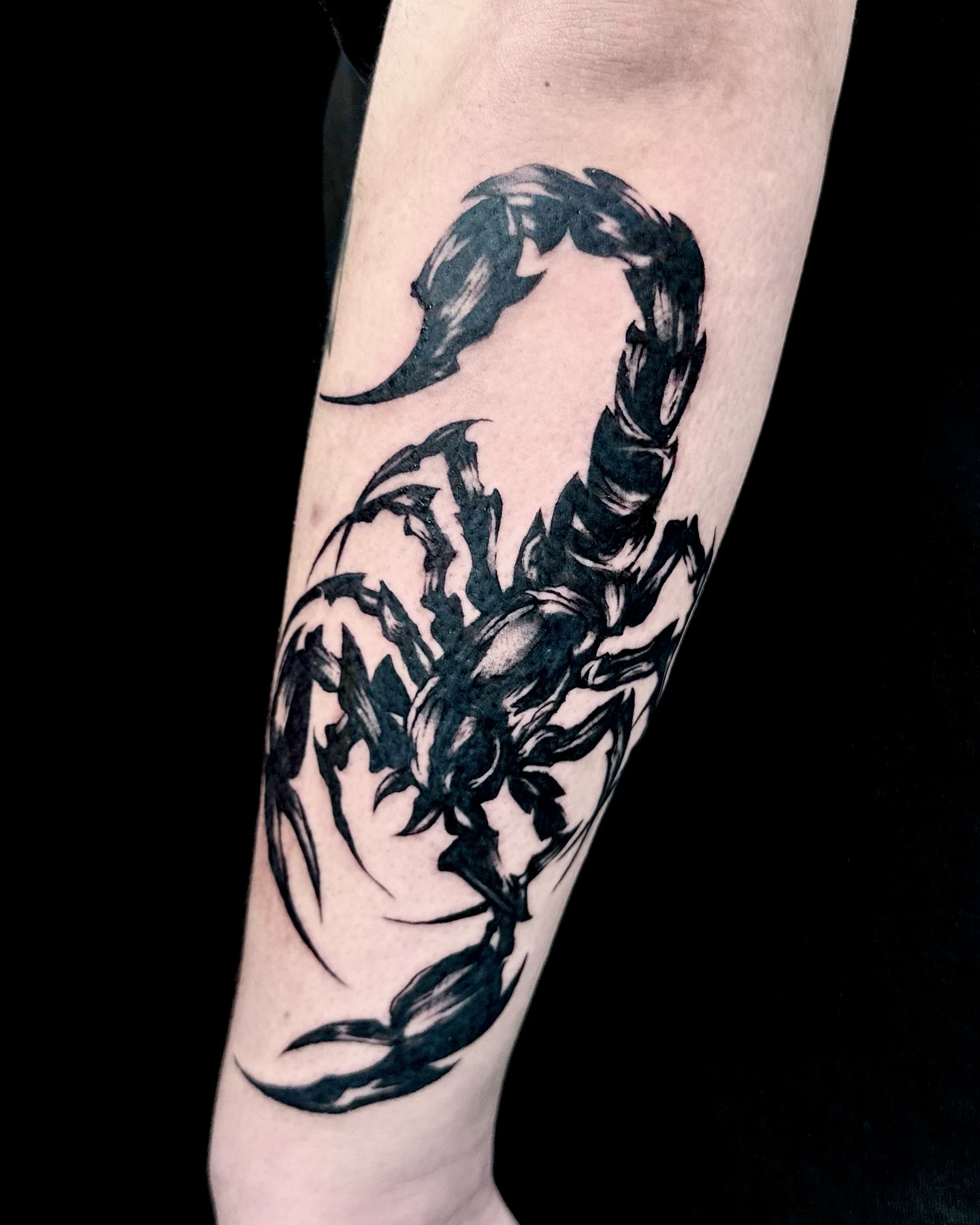 This forearm tattoo transforms the scorpion into a bold blackwork piece, blending abstract brushstroke effects with detailed structure. The heavy black shading gives it a raw, powerful energy, while its chaotic strokes evoke movement and intensity.