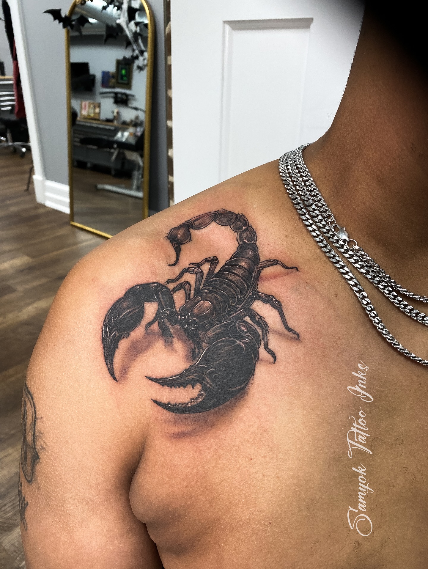 This shoulder tattoo showcases a hyper-realistic scorpion design, inked with incredible shading that creates a lifelike 3D effect. The sharp pincers and curved stinger seem to crawl across the skin, making the tattoo visually striking and dynamic. Shoulder placements highlight strength and masculinity, perfect for a bold statement piece.
