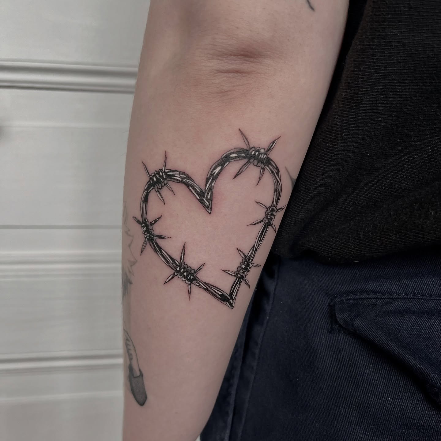 This bold heart tattoo is crafted entirely from barbed wire, symbolizing strength, resilience, and guarded emotions. The sharp details of the spikes contrast against the soft symbolism of the heart, creating a design that represents love protected by barriers. It may reflect someone who has endured hardship, heartbreak, or challenges but still holds love at their core.